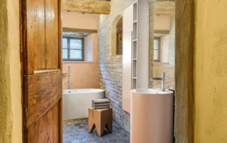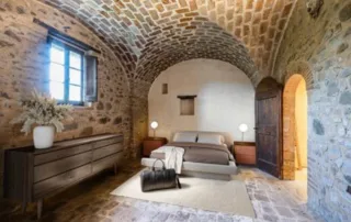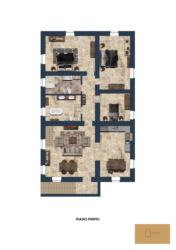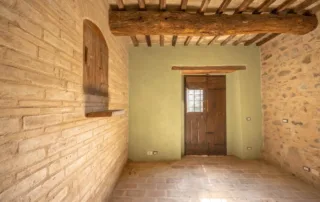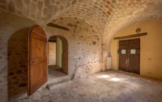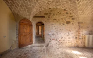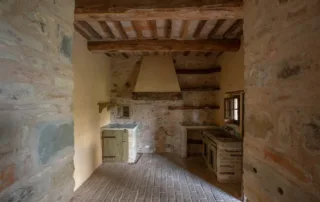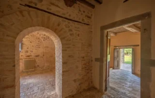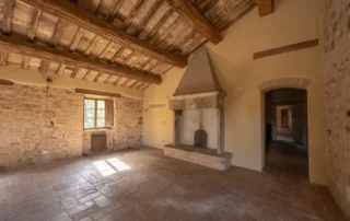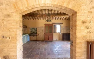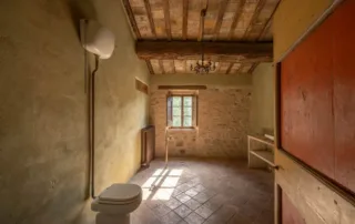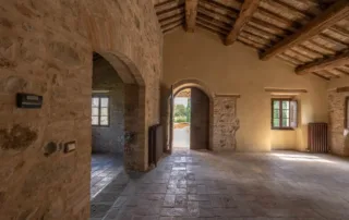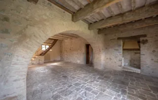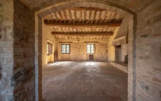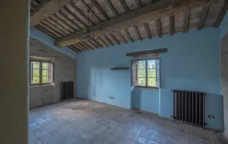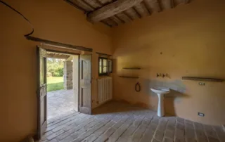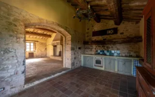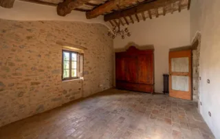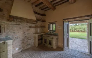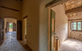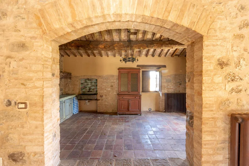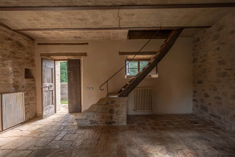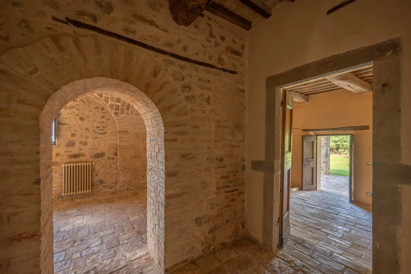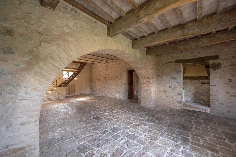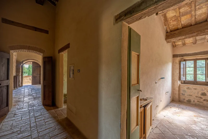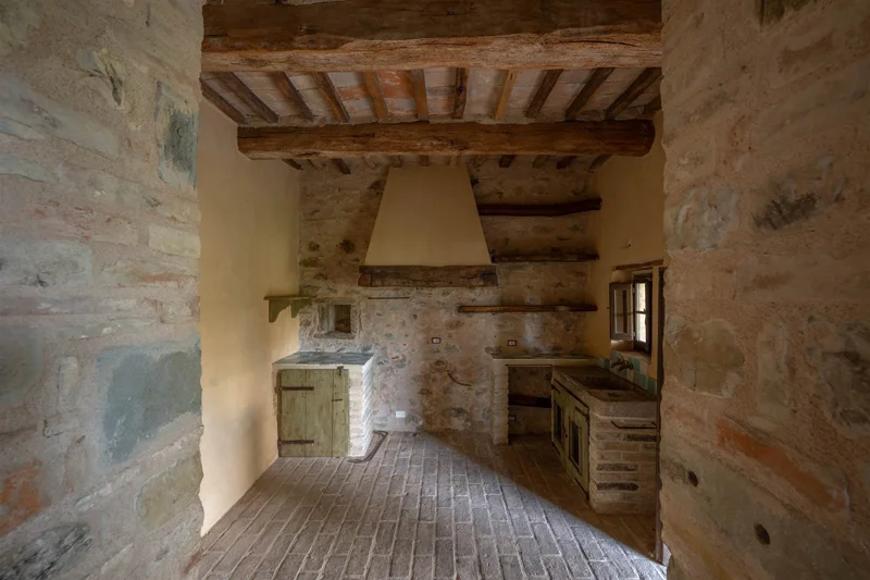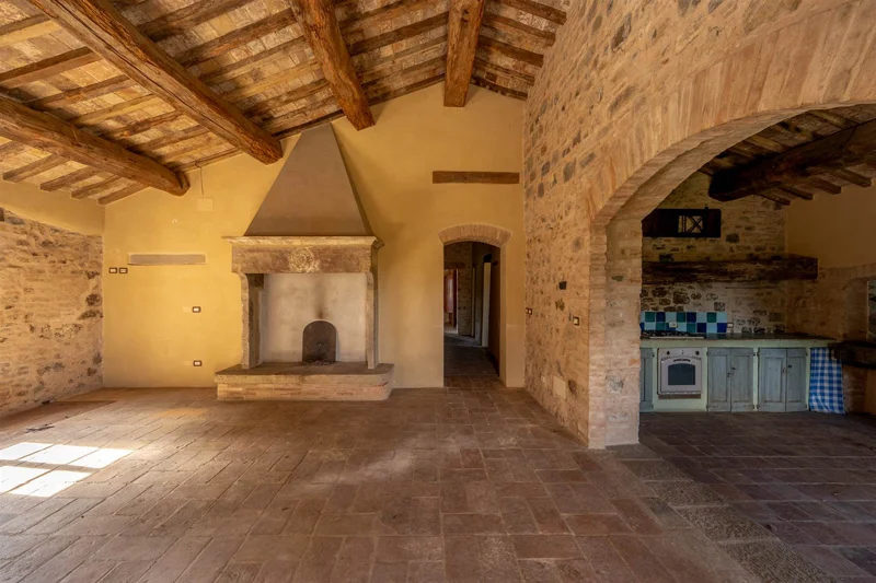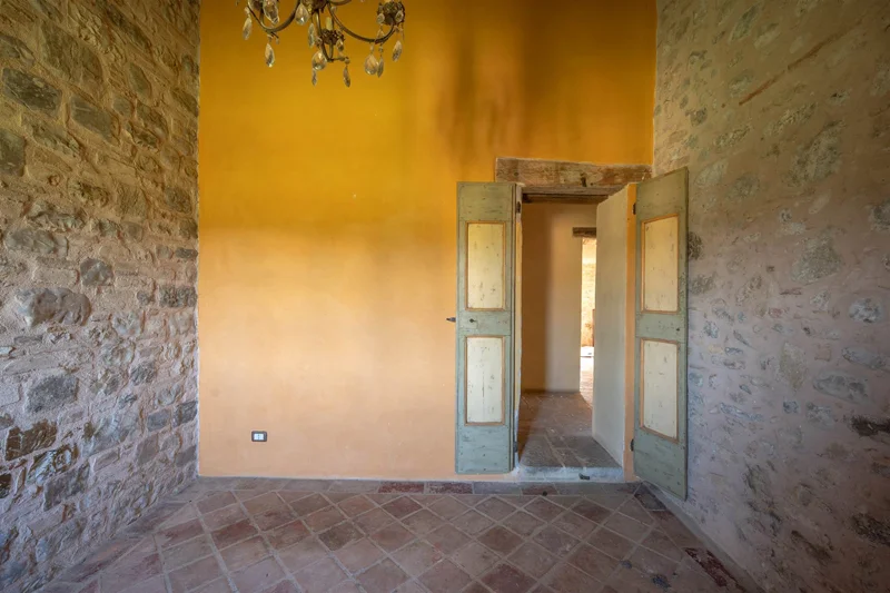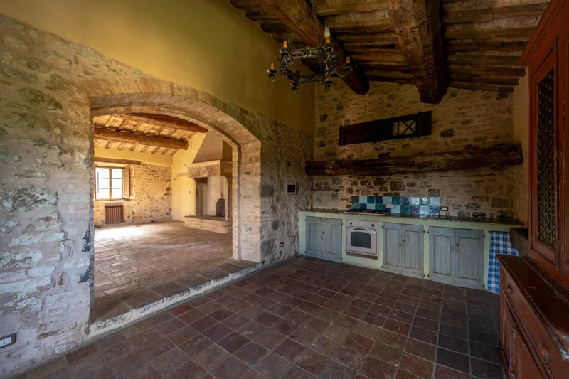 Una scala in pietra e mattoni, dal fascino autentico, conduce al piano superiore. Qui si trova un secondo salone elegante, arricchito da un grande camino in stile retrò, cuore conviviale della casa. La cucina principale, ampia e luminosa, si affaccia sul paesaggio circostante ed è pensata come vero ambiente di vita. Un corridoio arioso collega le tre camere da letto, ognuna caratterizzata da soffitti con travi in legno e pavimenti in pianelle originali. A completare il piano, due bagni che uniscono comfort moderno e dettagli tradizionali.