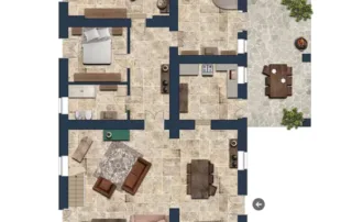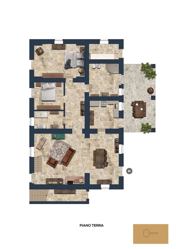The entrance opens into a large living room with rustic details that immediately convey warmth and hospitality. The spacious and functional kitchen connects directly to the external porch, ideal for outdoor dining with views of the garden and pool. The sleeping area consists of two bright bedrooms and a bathroom, perfect for guests or for creating an independent suite.