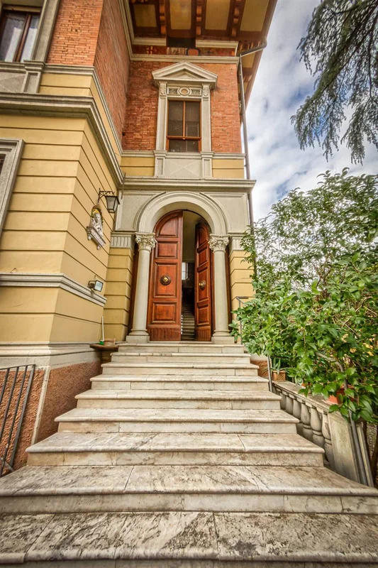 Al piano Primo si accede dalla porta principale che ci conduce al primo appartamenti dove troviamo un grande e luminoso salone con camino. Da qui si passa poi allo studio, alla grande sala da pranzo con tavolo per sedici persone, a una spaziosa cucina, alle camere ed ai bagni. All’esterno, un grazioso giardino.